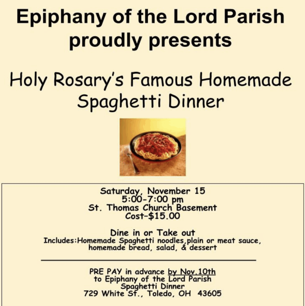 PREPAY: Epiphany of the Lord Parish proudly presents Holy Rosary’s Famous Homemade Spaghetti Dinner